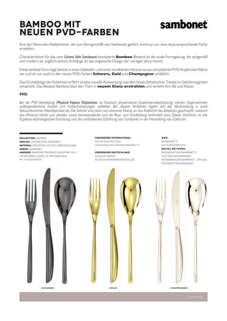 Bei der PVD-Veredelung (Physical Vapour Deposition, zu Deutsch: physikalische Gasphasenabscheidung) werden Gegenständen außergewöhnliche Farben und Farbschattierungen verliehen. Bei diesem Verfahren lagern sich bei Verdampfung in einer Vakuumkammer Metallpartikel ab. Die Schicht wird dann auf atomarer Ebene an das Edelstahl des Bestecks geschweißt, wodurch das Material härter und abriebs- sowie korrosionsfester und die Rost- und Oxidbildung verhindert wird. Dieses Verfahren ist das Ergebnis technologischer Forschung und der umfassenden Erfahrung von Sambonet in der Herstellung von Edelstahl.